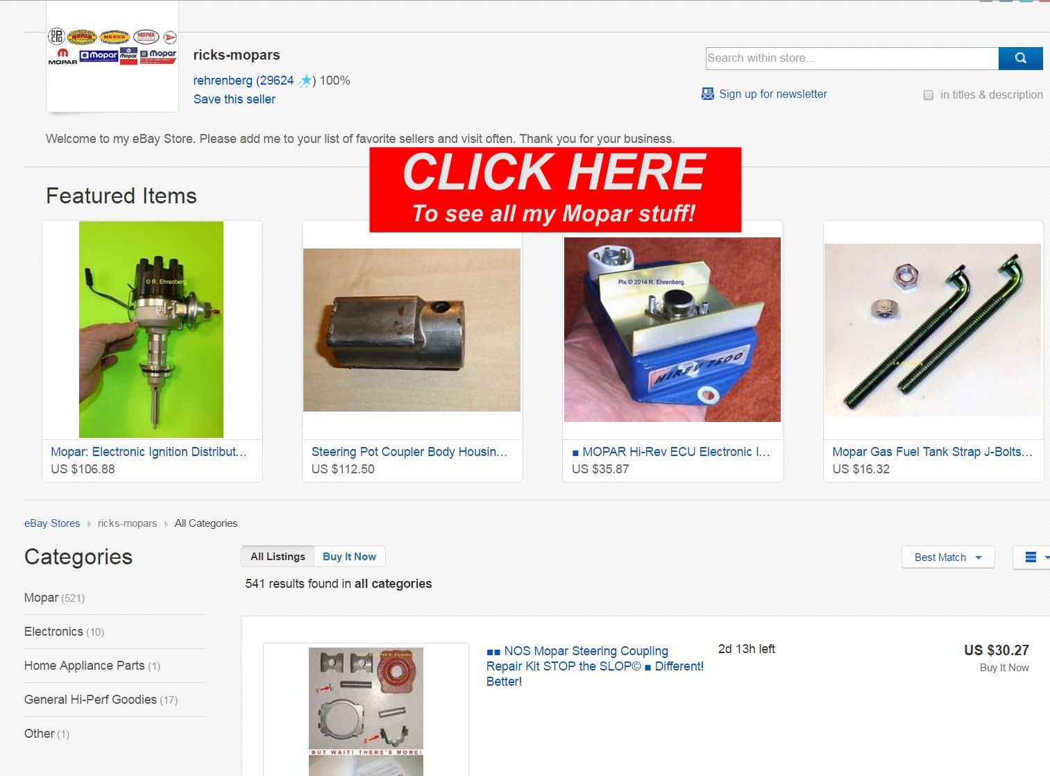 Welcome to Rick Ehrenberg’s page. I’ve been into Mopars since 1960, and have written over 1,000 Mopar-specific technical articles for magazines such as Mopar Action, High Performance Mopar, Musclecars, Popular Hot Rodding, etc. I own all the tech article archives from Mopar Action, I will be posting them here as soon as I find time. I also have amassed a huge collection of parts, mostly to keep my fleet of personal Mopars running! If you need parts, chances are I have some stuff that you’ll find useful, I have everything on an eBay store (link below), but, if you'd rather contact me directly (send your wish list), I can save you $$$, never less than 8%. To get in touch with me directly, please click on the "r..." link below and enter the challenge phrase to reveal my e-mail address: r......@yahoo.comThanks for your support, Richard “Rick” Ehrenberg